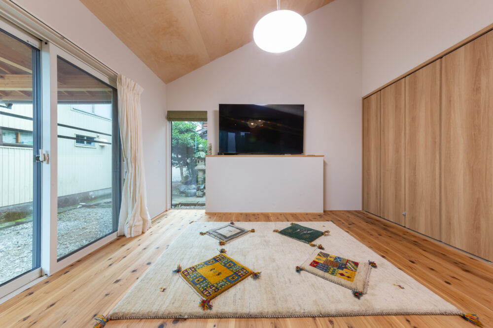 家族の憩いの場になっている寝室。テレビ横にはお庭を眺められる窓を設置。